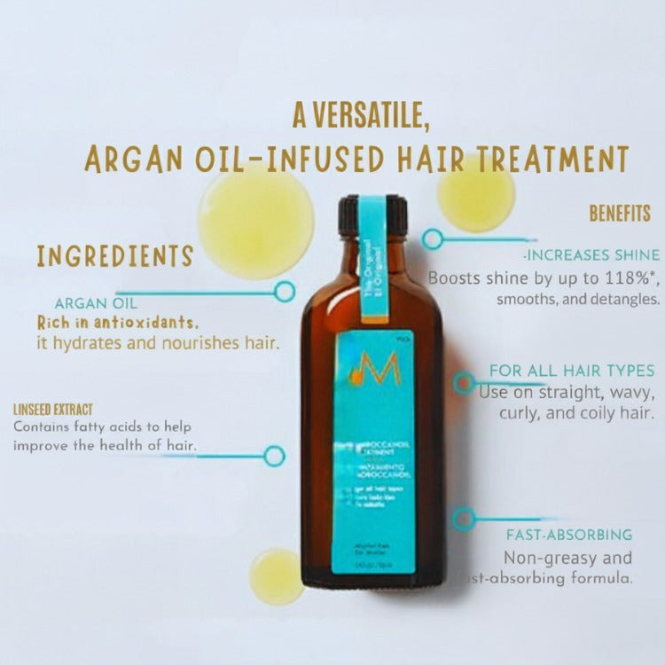 The Moroccanoil Treatment is a lightweight, nourishing argan oil formula that instantly smooths frizz, adds natural shine, and strengthens hair without weighing it down. It repairs split ends, protects against heat styling, and leaves all hair types silky, healthy, and manageable with every use.